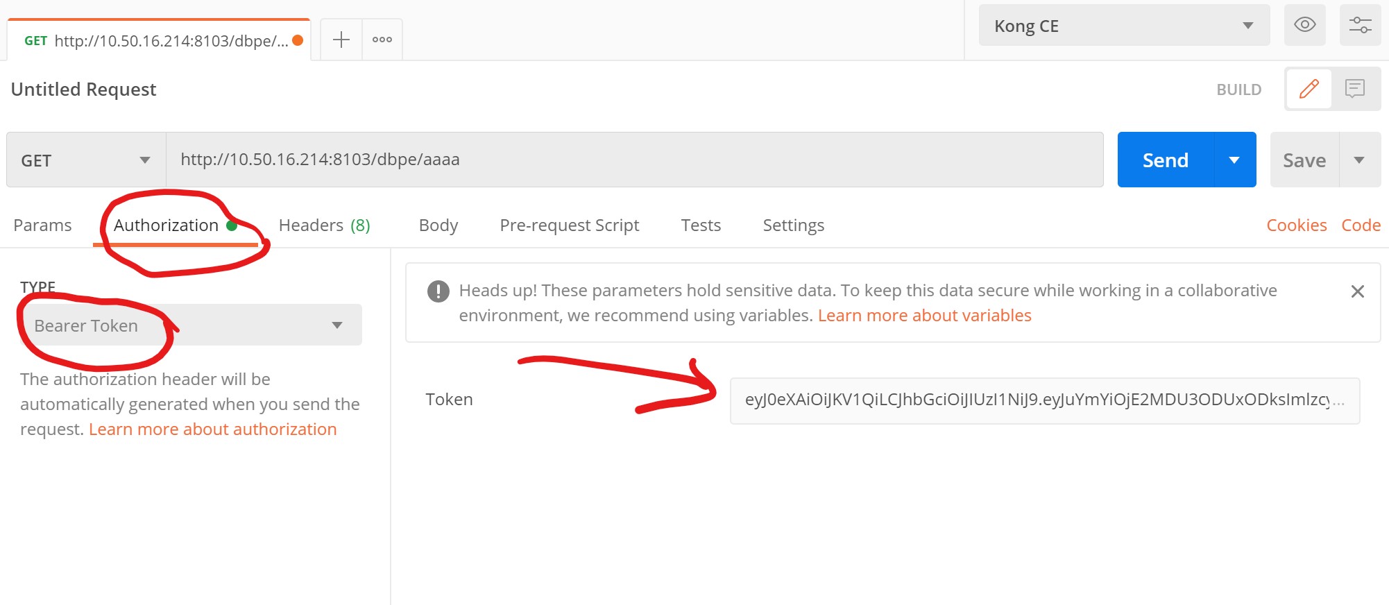 在postman中选择Authorization - Bearer Token,填入生成的token,如下图所示